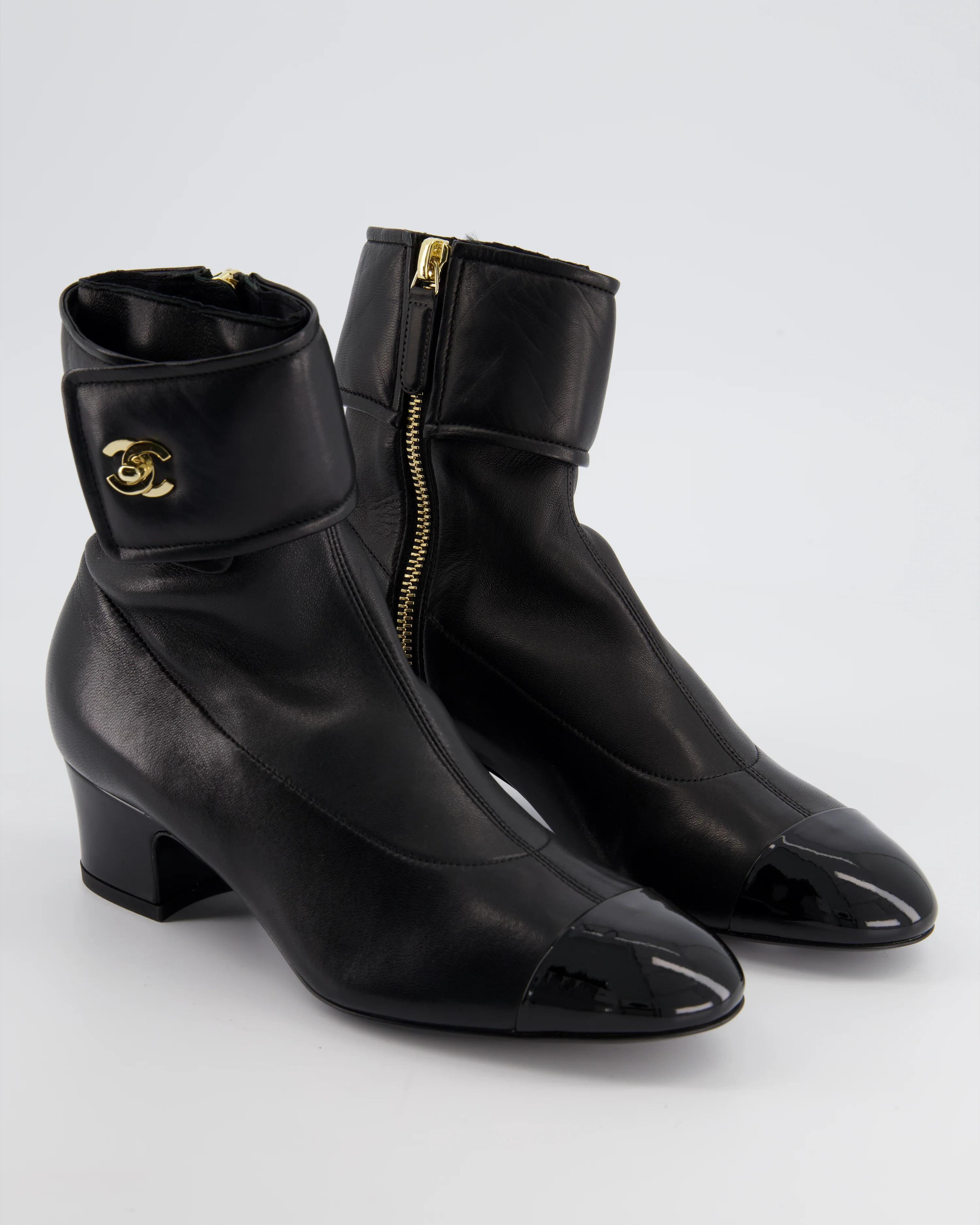 Chanel Black Leather Ankle Boots with Patent Toe and Champagne Gold CC Logo Detail Size EU 35.5C