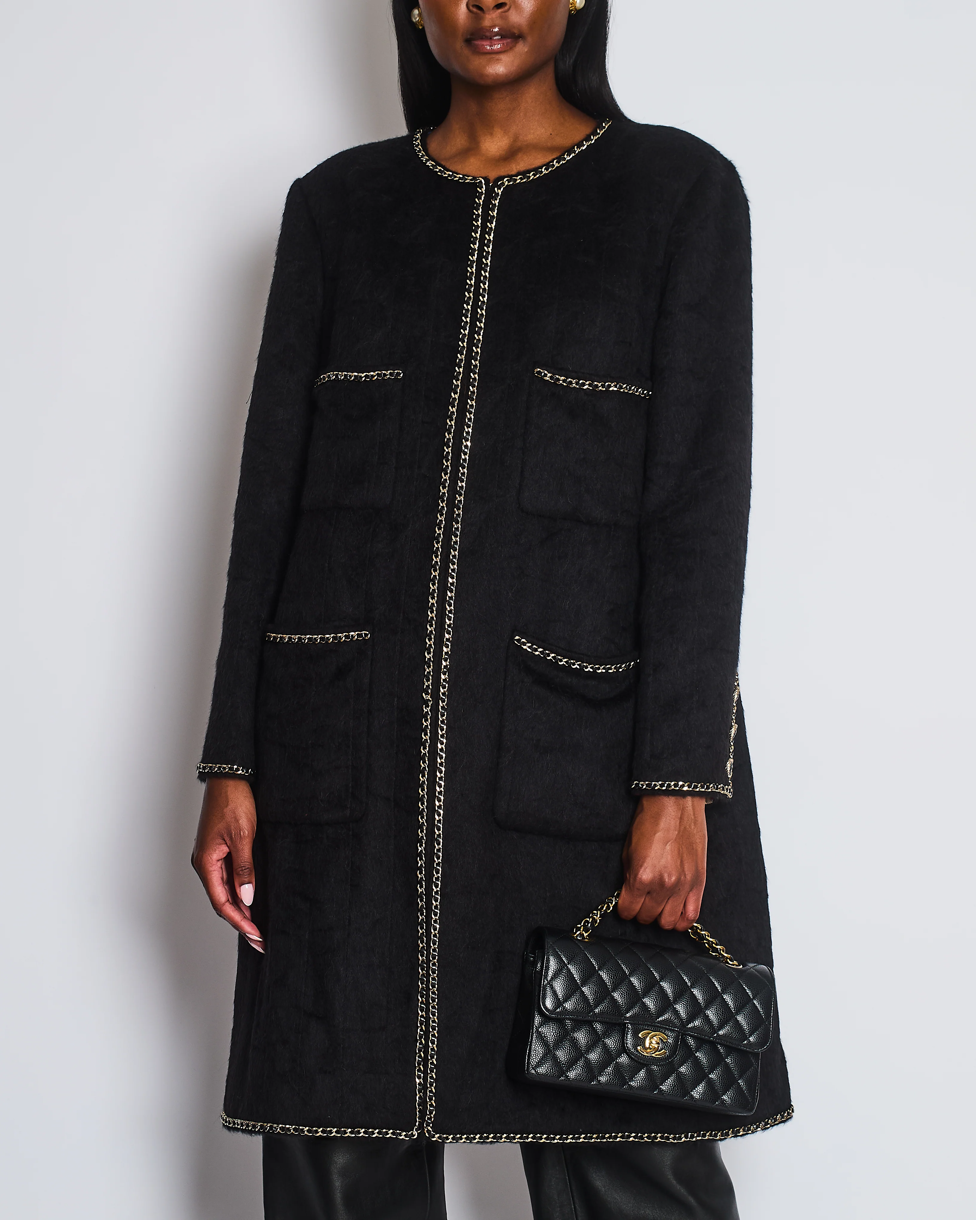 *HOT* Chanel 19A Black Llama & Wool Coat with Gold Chain Trim and CC Buttons Size FR 44 (UK 12) RRP £6,730